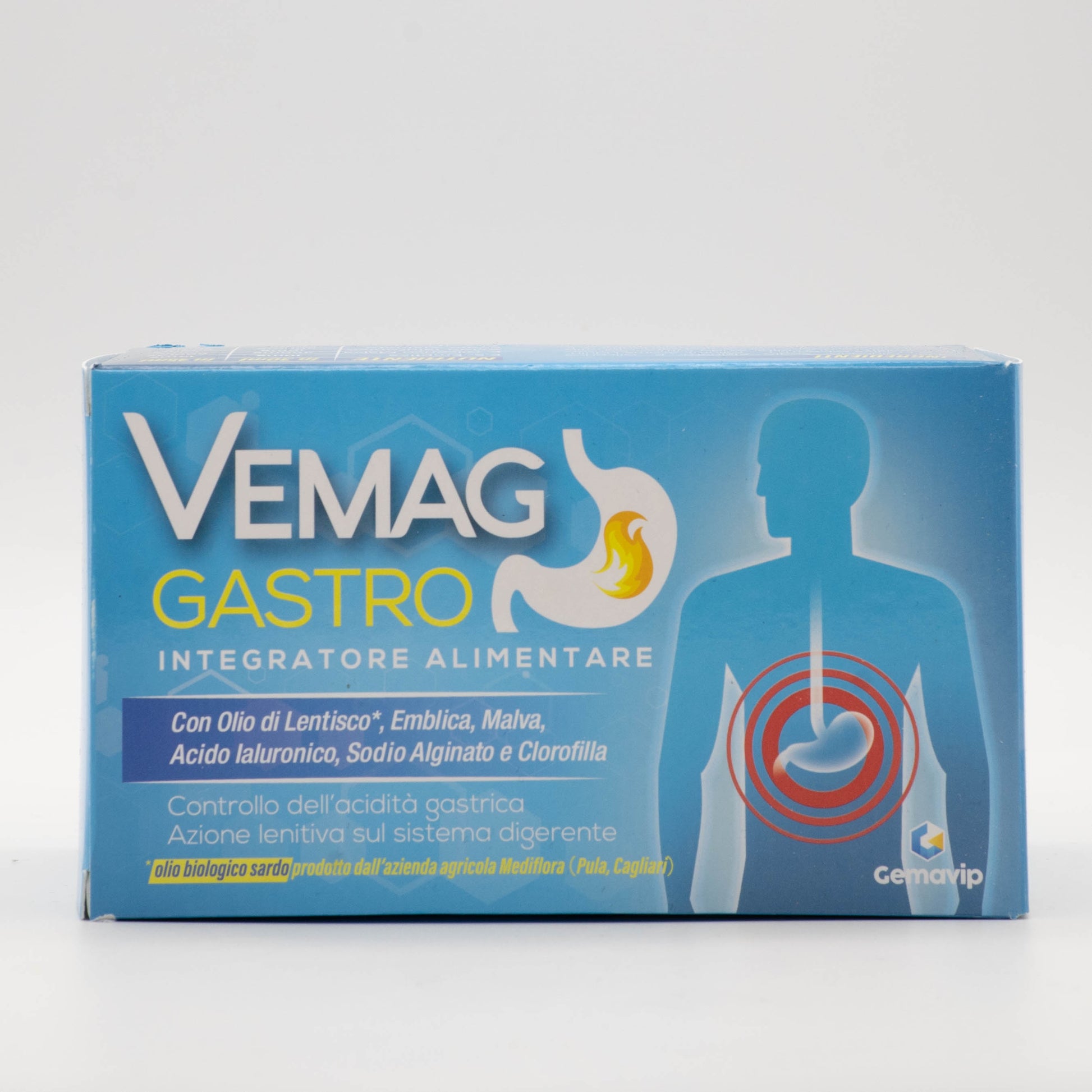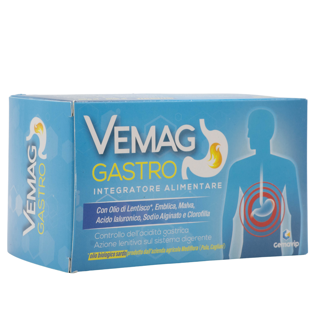 Vemag Gastro è un integratore alimentare a base di Emblica officinale, che favorisce il controllo dell’acidità gastrica e Malva, che svolge un’azione emolliente e lenitiva sul sistema digerente. Sodio jaluronato, Sodio alginato, Olio di lentisco e Clorofilla nè arricchiscono la formulazione. L’olio di Lentischio è un olio biologico sardo prodotto dall’azienda Mediflora di Pula (CA).