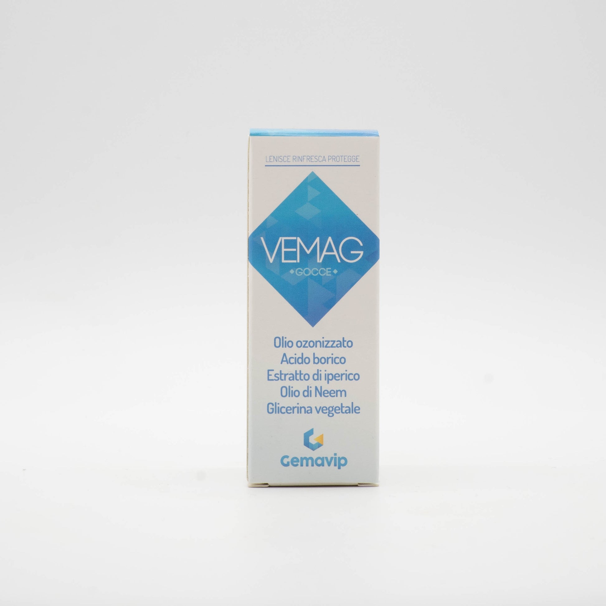 Vemag gocce, lenisce, rinfresca e protegge. Utile ad attenuare e liberare la parte da ogni residuo di impurità e da arrossamenti. Uso auricolare. Olio ozonizzato, Acido borico, Estratto di iperico, Olio di Neem, Glicerina vegetale.